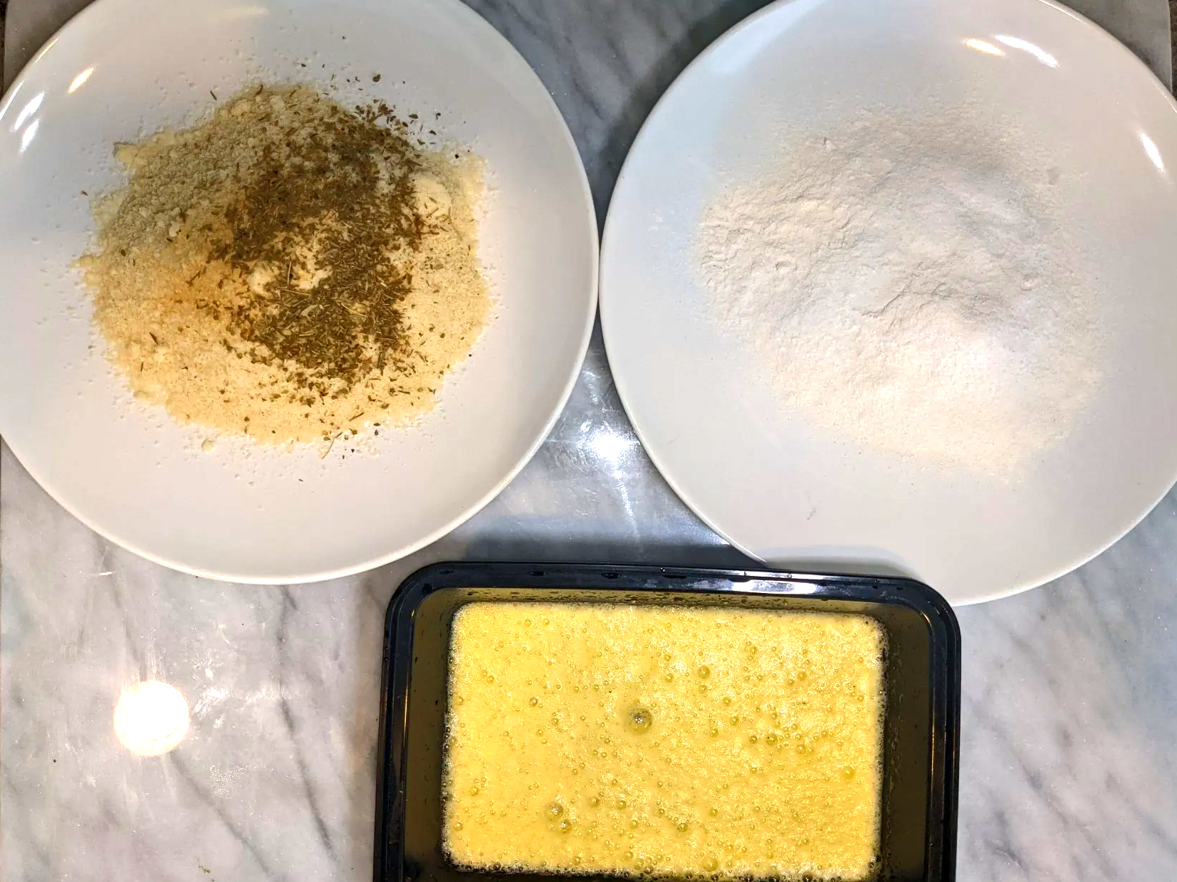 Create a workspace with 2 plates & a bowl. Add the cassava flour plus 1/2 tsp of salt to one plate. In a large bowl, add the almond flour, 1 tbsp oregano, 1 tsp salt, & 1/2 tsp ground pepper & mix until well combined. Grab another plate & add 1/2 cup of the almond flour mixture. You'll add the rest in batches while you coat your eggplant & chicken so the whole mixture doesn't get clumpy. In a bowl, (I used a meal prep container here) whisk up your eggs. Start breading your eggplant first (raw chicken has bacteria & you don't wanna spread that around even though you'll be cooking everything). Dip the eggplant in the cassava flour, then egg mixture, & lastly covering it with the almond flour. Repeat this process until you have all your eggplant "breaded," then repeat the process for the chicken.