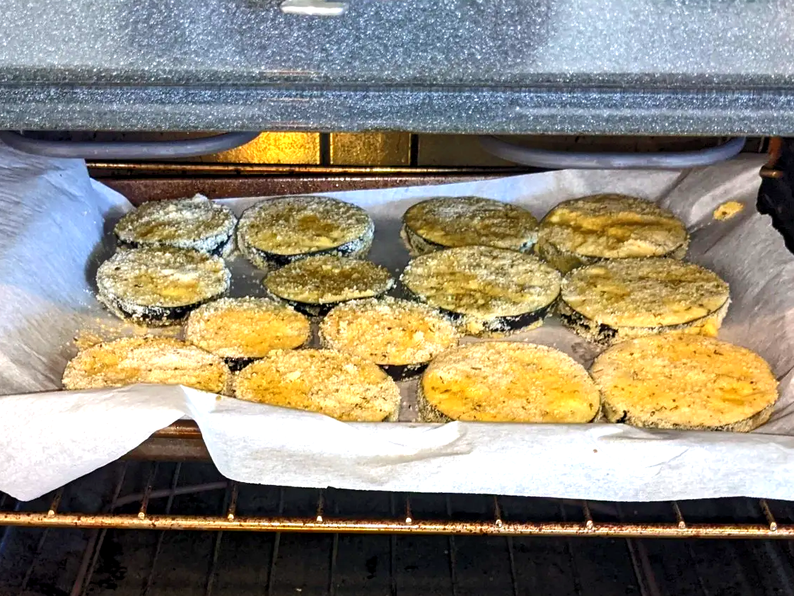 In 1 sheet pan, add the breaded eggplant, & in another, add the breaded chicken. Roast them in the oven for 15 minutes, take it out & flip everything over & rotate pans, then cook for another 15 minutes. Remove the eggplant from the oven & let the chicken cook for another 10 minutes.